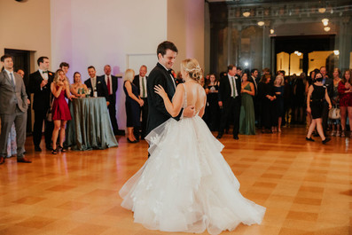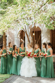 Annie + Andy wanted natural elements in their wedding! Melanie and the floral team thought natural potted plants as centerpieces would not only be a cost effective choice, but also doubled as guests take home favors. The chargers are from A Finer Event and tied in perfectly with this theme and color palette. They were a perfect, classy, nature inspired touch to bring the table settings together. AS fate would have it, Andy and Annie found out a few months before their wedding they would not be able to get married in their church as originally planned. Our planning team pivoted and decide to use the Library's auditorium as the new ceremony space!